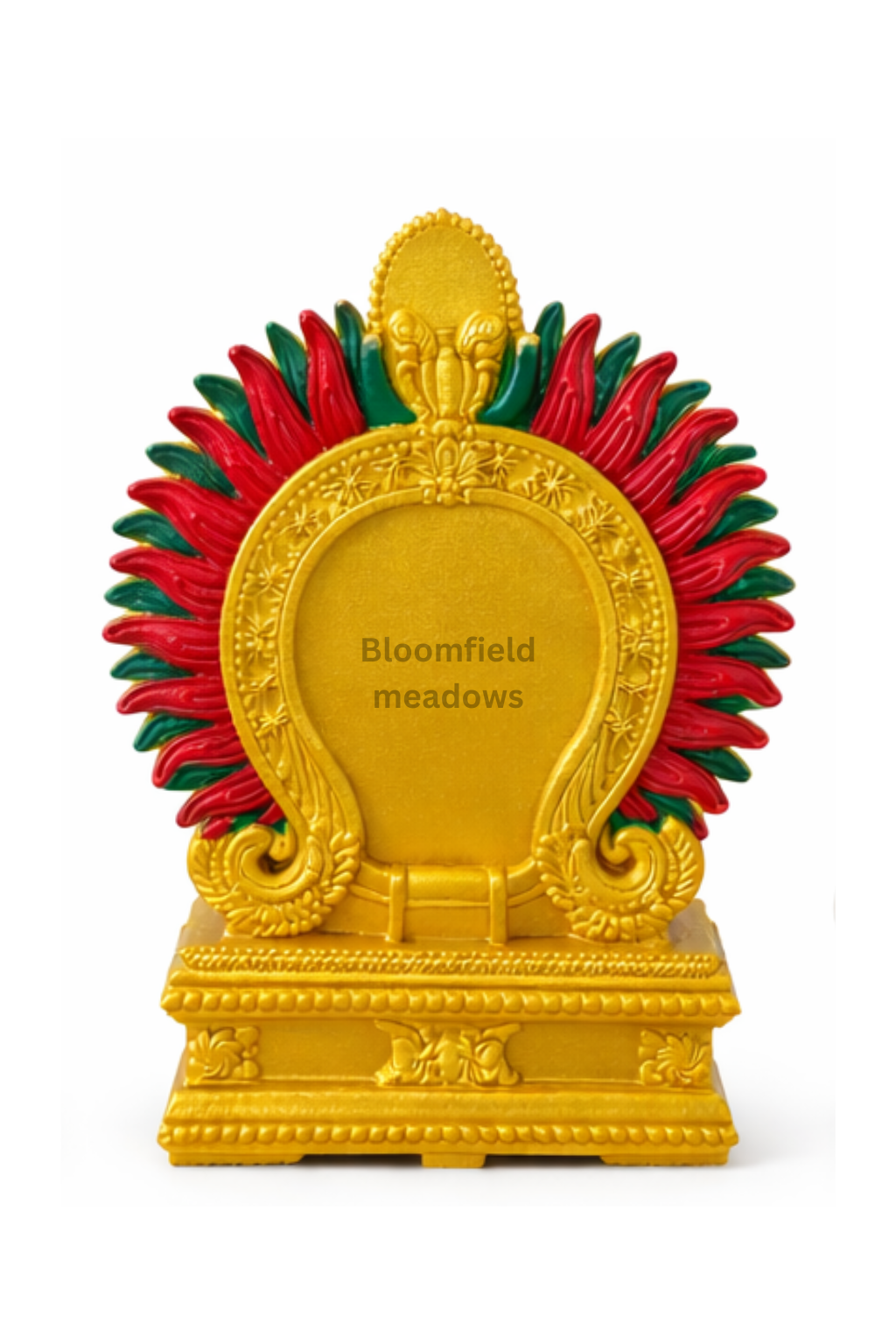 यह सुंदरता से निर्मित भगवान गणेश की मूर्ति शांत मुद्रा में आकर्षक रंगों और बारीक नक्काशी के साथ दर्शाई गई है। सुनहरे मुकुट और सजावटी मेहराब से सुसज्जित यह प्रतिमा ज्ञान, समृद्धि और शुभ आरंभ का प्रतीक है, जो पूजा घर, गृह मंदिर और त्योहारों की सजावट के लिए उपयुक्त है।The back view features an ornate golden arch with vibrant red and green detailing, showcasing fine craftsmanship and a radiant divine finish.