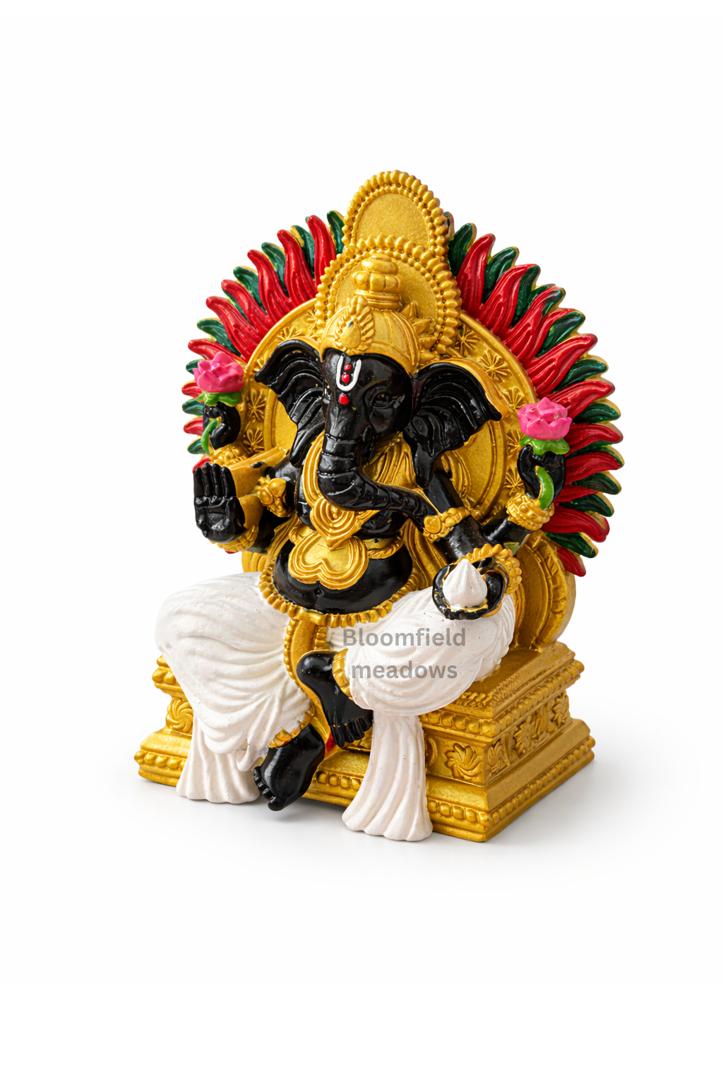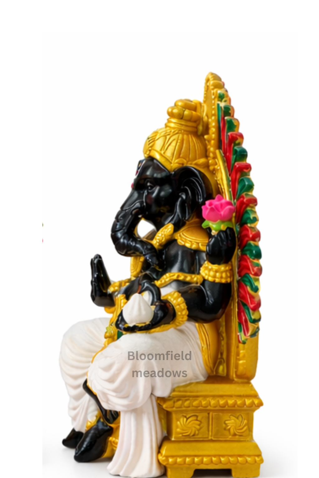 இந்த அழகாக வடிவமைக்கப்பட்ட விநாயகர் சிலை, நுணுக்கமான வேலைப்பாடுகளும் உயிரோட்டமான நிறங்களும் கொண்ட அமர்ந்த நிலையில் காணப்படுகிறது. தங்க கிரீடம் மற்றும் அலங்கார வளைவுடன் கூடிய இந்த சிலை, ஞானம், செழிப்பு மற்றும் நல்ல தொடக்கங்களை குறிக்கிறது. வீட்டுக் கோவில், பூஜை அறை மற்றும் பண்டிகை அலங்காரத்திற்கு சிறந்தது.